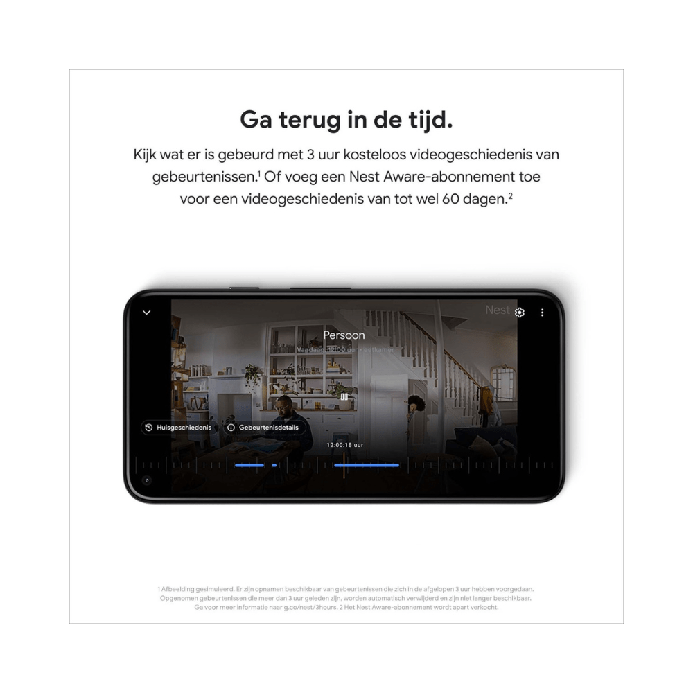 • Voor continue video-opnamen met de Nest Cam Indoor op batterijvoeding heb je een kabelaccessoire nodig. Deze wordt apart verkocht