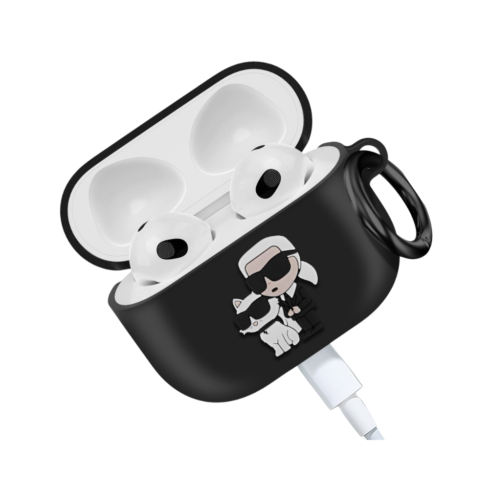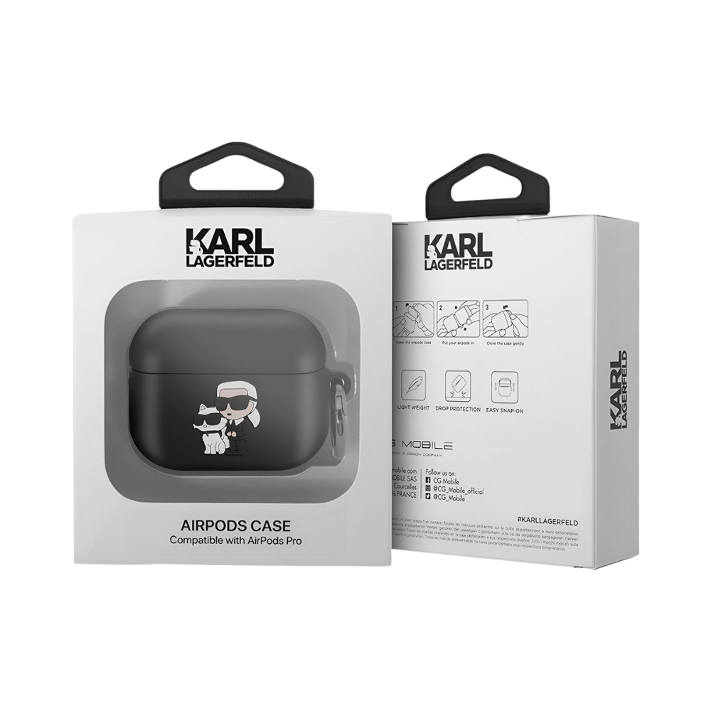 Etui voor AirPods Pro van Karl Lagerfeld. Het moderne, trendy ontwerp weerspiegelt perfect de creatieve geest van Karl Lagerfeld. De flexibele siliconen zorgen voor een eenvoudige installatie en een perfecte pasvorm. Dankzij de geรฏntegreerde ring kun je hem altijd veilig dragen. Deze hoes biedt volledige toegang tot de oplaadpoort voor handig gebruik. Modern en trendy ontwerp.