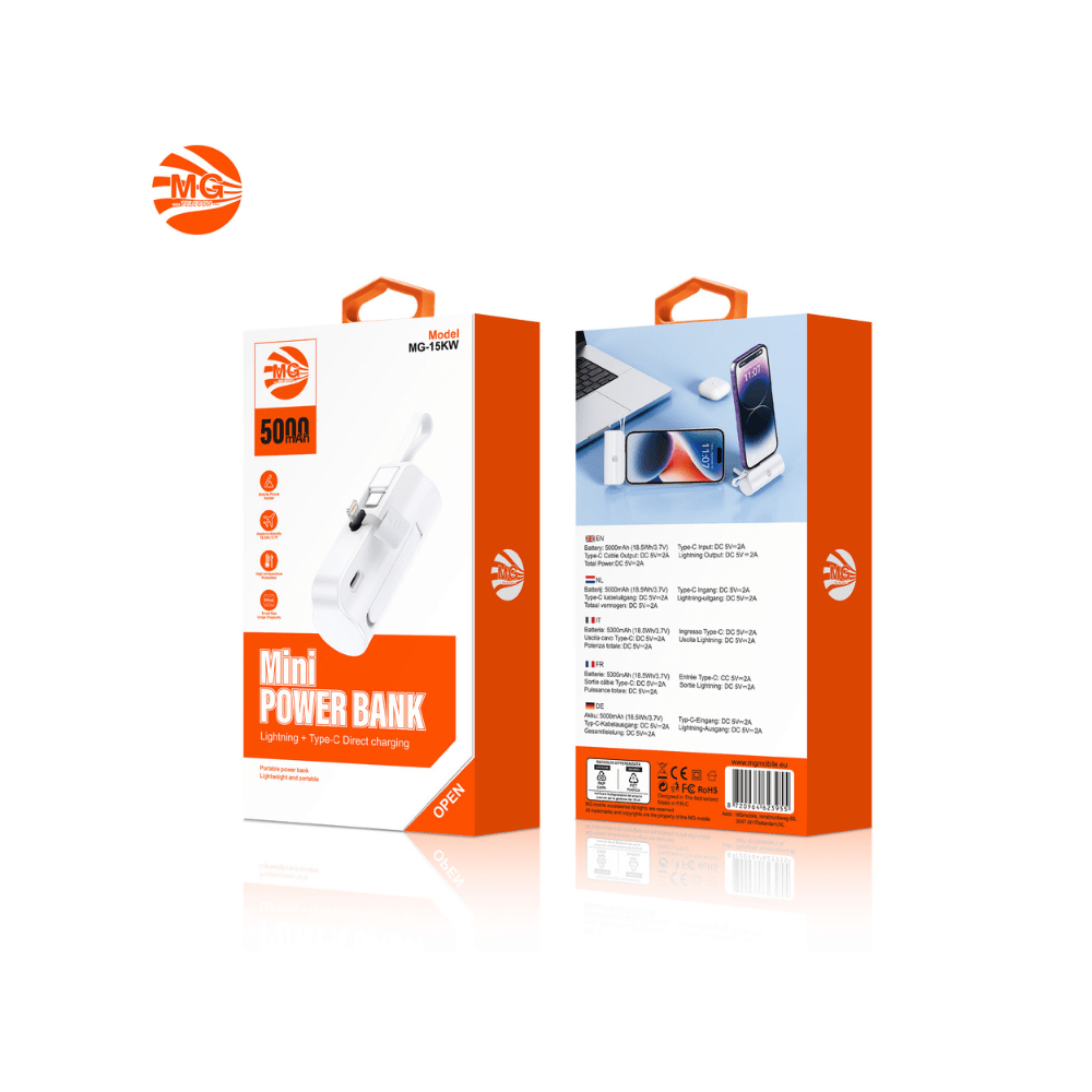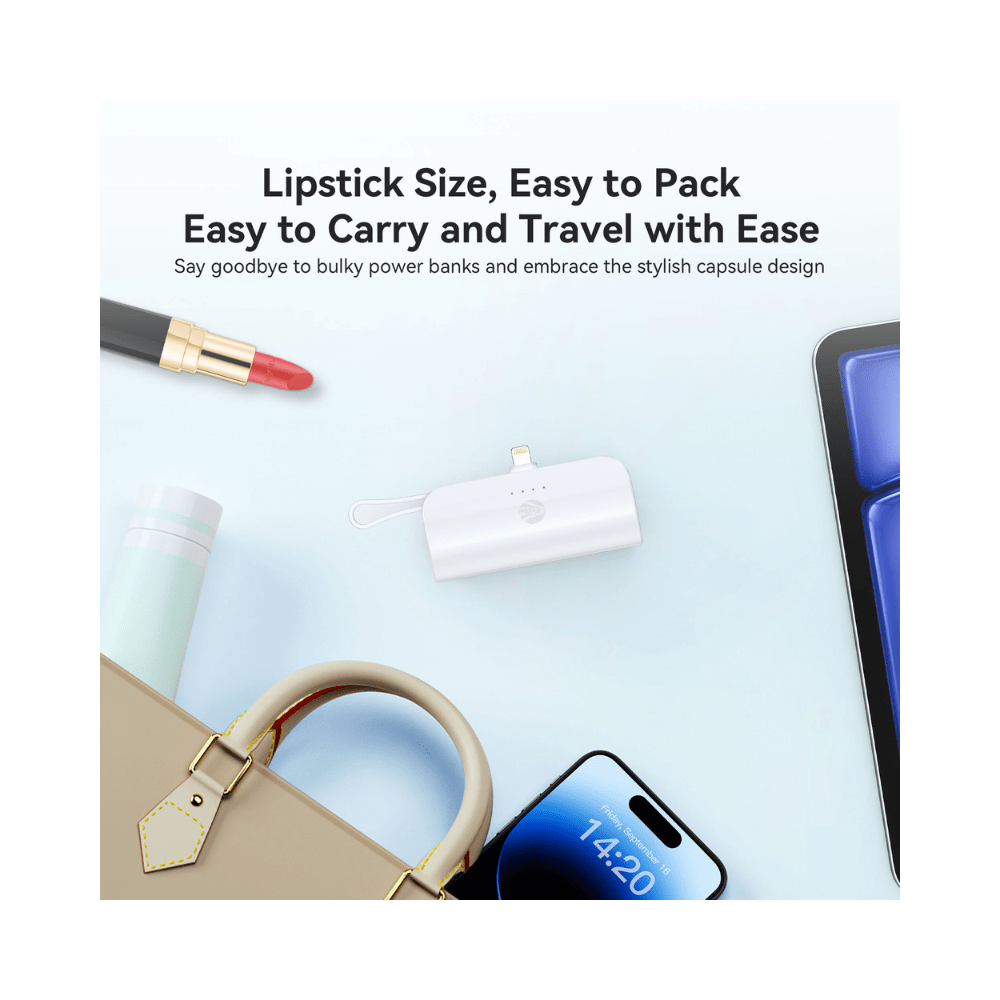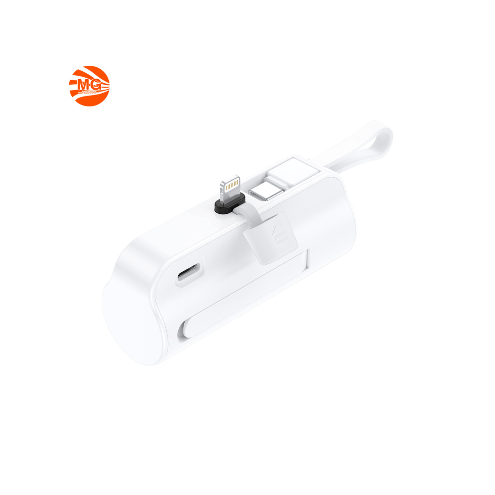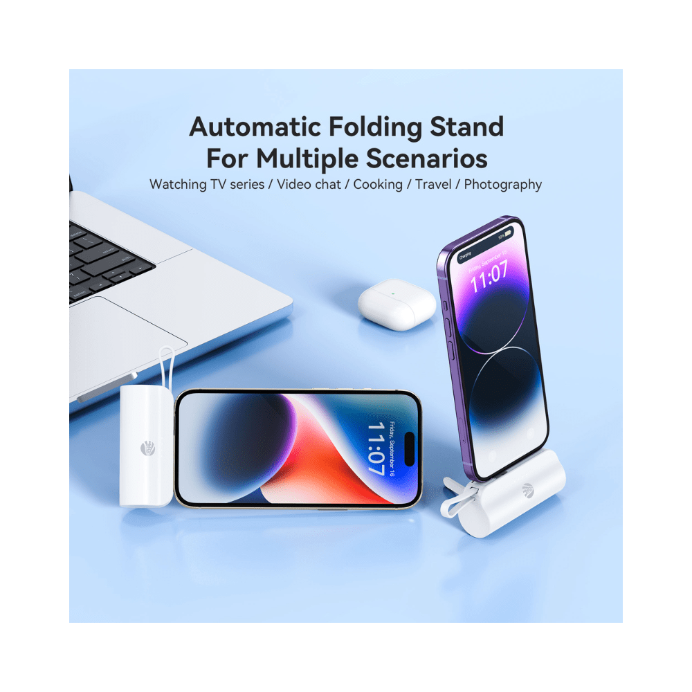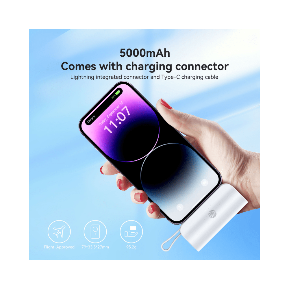 Deze ultracompacte 5000 mAh mini powerbank is de perfecte metgezel voor onderweg. Dankzij het slimme ontwerp met zowel Type-C als Lightning connectoren kun je twee apparaten tegelijk opladen, zonder extra kabels mee te nemen.