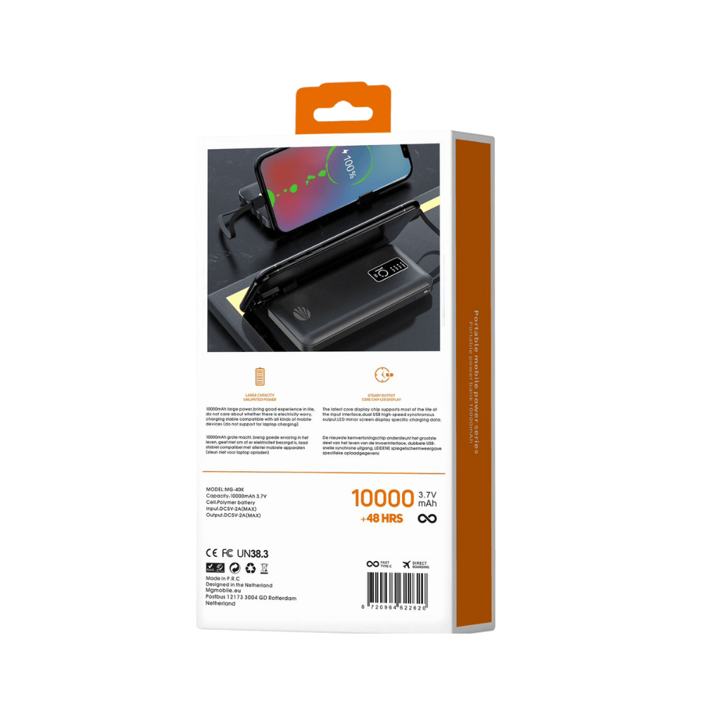 Of je nu een Android-telefoon, iPhone, draadloze oordopjes of een ander USB-apparaat gebruikt, met deze powerbank heb je alles in รฉรฉn. De kabels zijn netjes geรฏntegreerd in het ontwerp, wat het extra handig maakt voor onderweg of op reis.