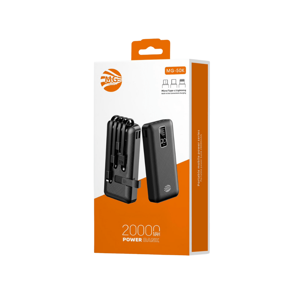 20.000 mAh Powerbank met Ingebouwde Kabels โ Micro-USB / USB-C / Lightning