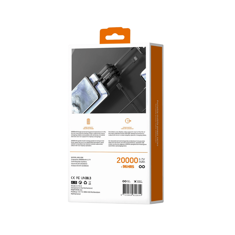 - Capaciteit: 20.000 mAh โ genoeg voor meerdere oplaadbeurten