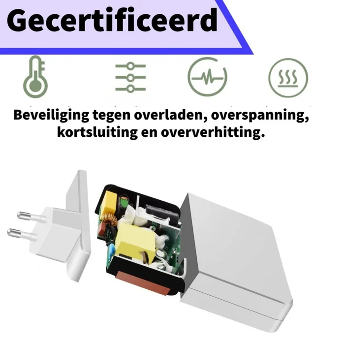 Het compacte en duurzame ontwerp in wit zorgt voor een professionele uitstraling en maakt het eenvoudig om de adapter mee te nemen, zowel voor dagelijks gebruik als onderweg. De adapter is voorzien van geavanceerde veiligheidskenmerken, zoals oververhittings- en overspanningsbeveiliging, waardoor zowel uw apparaten als de oplader zelf veilig blijven tijdens het gebruik.