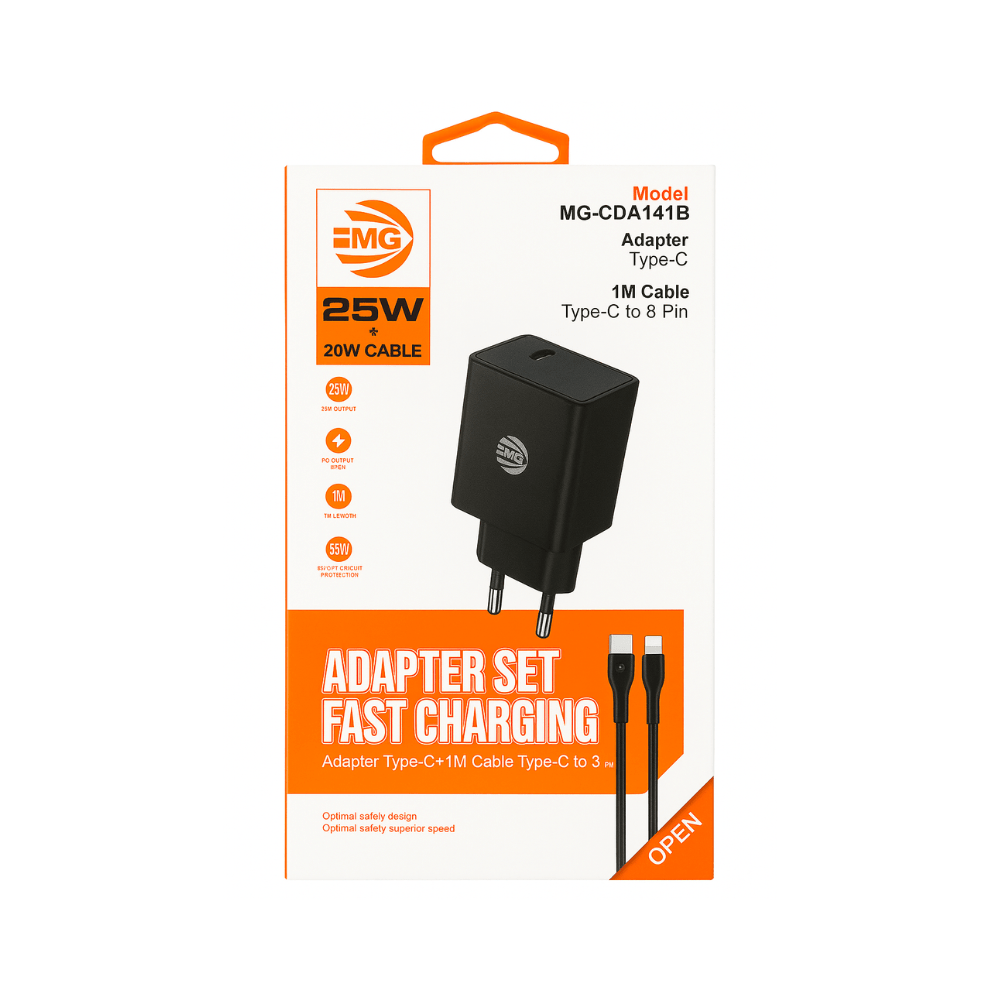 De MG-CDA141B Adapter Set is de perfecte keuze voor gebruikers die snelheid en veiligheid combineren met veelzijdigheid. Deze set bevat een 25W Type-C adapter en een 20W Type-C naar 8-Pin kabel, speciaal ontworpen voor Apple-apparaten zoals iPhones en iPads.
