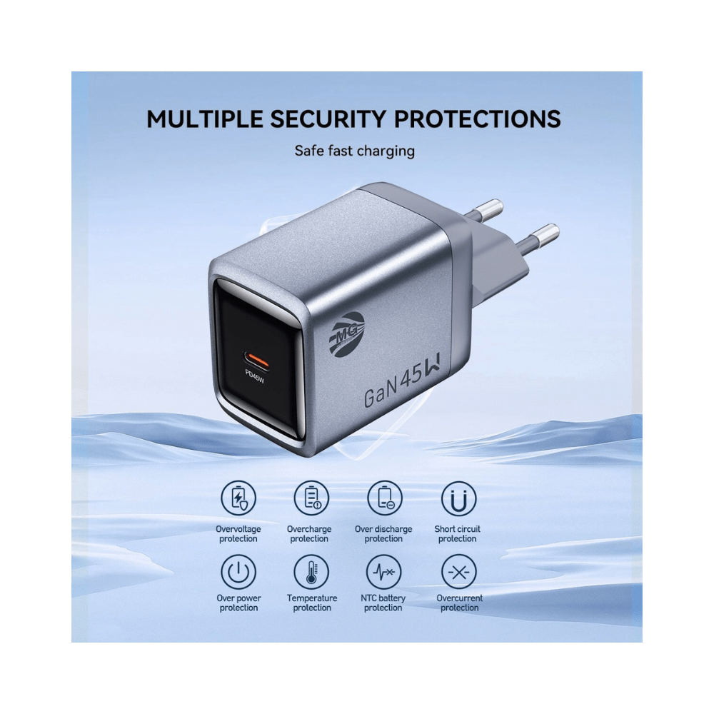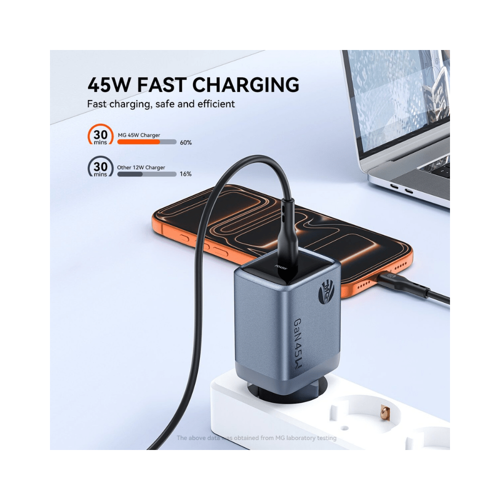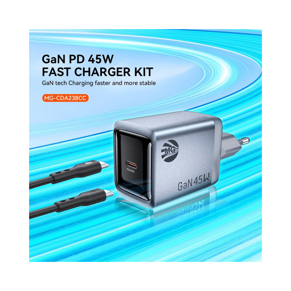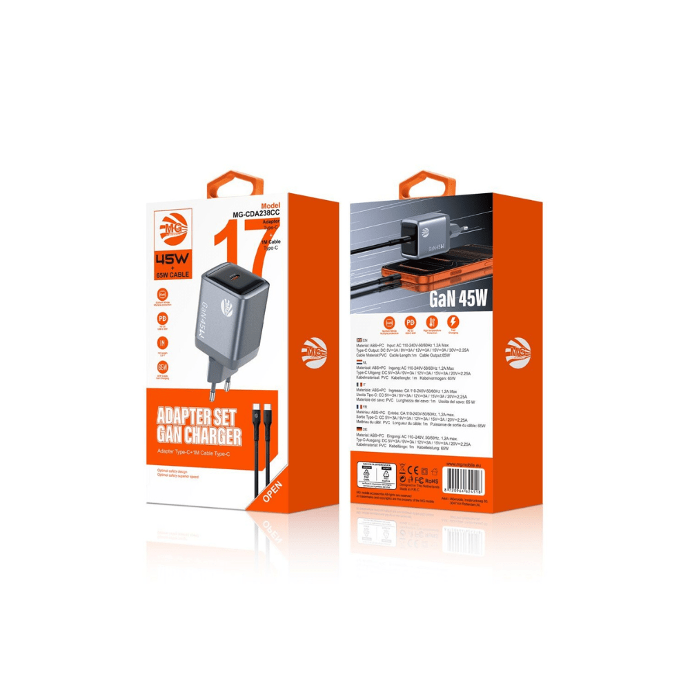 De MG CDA238CC Adapter Set bevat een krachtige 45W GaN snellader รฉn een 1 meter lange 65W Type-C kabel voor maximale prestaties.