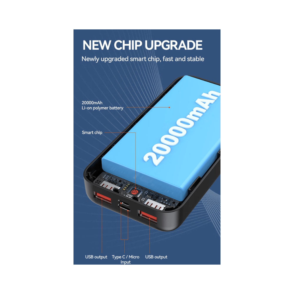 De Draagbare Powerbank van 20.000mAh biedt de ultieme oplossing voor het opladen van twee apparaten tegelijk, waar je ook bent. Met een grote capaciteit van 20.000mAh kun je jouw smartphones, tablets of andere apparaten meerdere keren opladen zonder je zorgen te maken over de batterijduur. De powerbank is ontworpen voor snel en efficiรซnt opladen, zodat je apparaten snel weer klaar zijn voor gebruik. Het slanke en stijlvolle zwarte ontwerp maakt het eenvoudig om de powerbank mee te nemen, of je nu onderweg bent, op vakantie of op het werk. Dankzij de dual USB-poorten kun je gelijktijdig twee apparaten opladen, waardoor je altijd en overal voldoende energie hebt.