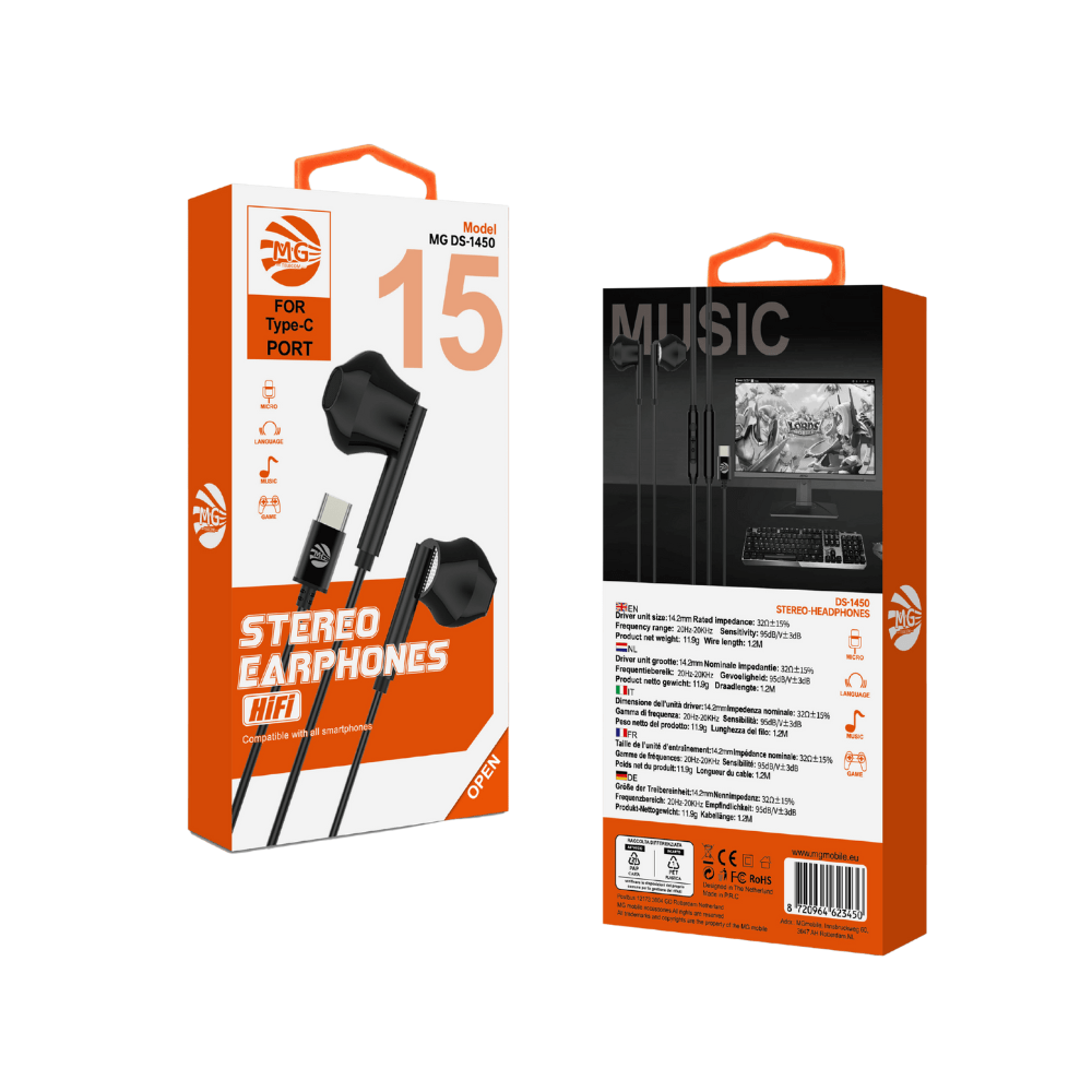 De MG DS-1450 Stereo Earphones zijn ontworpen voor apparaten met een USB Type-C aansluiting en bieden een combinatie van helder Hi-Fi geluid, duurzaam design en optimaal draagcomfort. Ideaal voor dagelijks gebruik โ of je nu muziek luistert, belt of videoโs bekijkt.