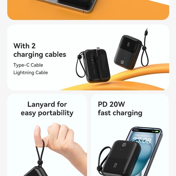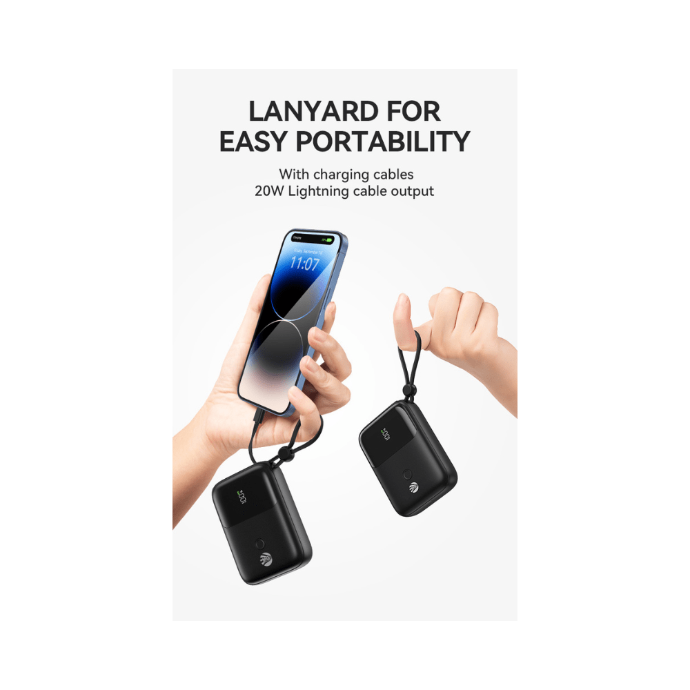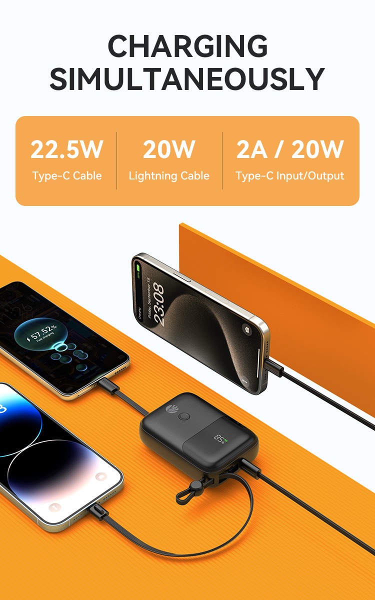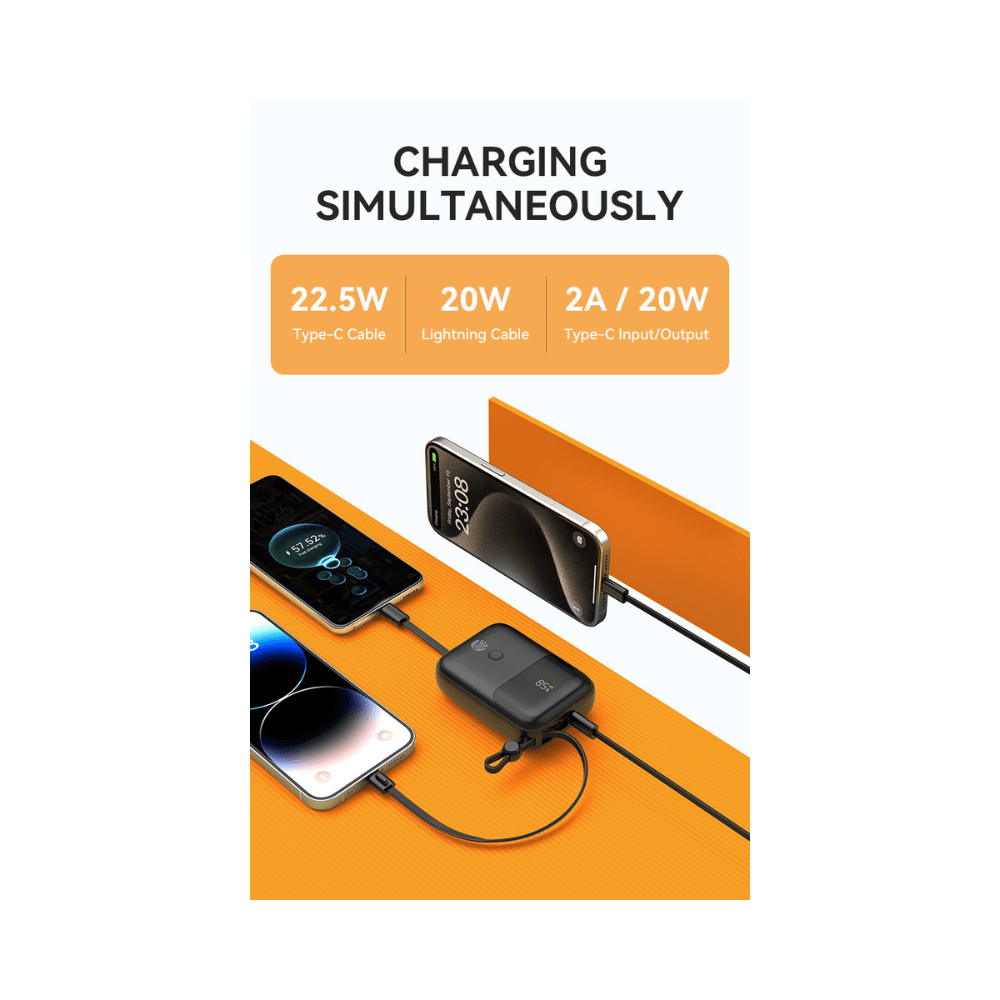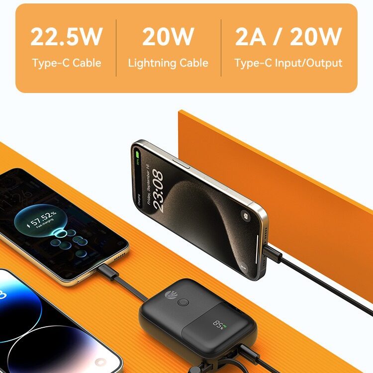 De powerbank is uitgerust met een USB-C-poort voor snel en efficiรซnt opladen, en wordt geleverd met 2 handige oplaadkabels, zodat je direct aan de slag kunt โ ongeacht het apparaat dat je gebruikt. Of je nu een Android-, iPhone- of ander USB-apparaat hebt, je bent altijd voorbereid.