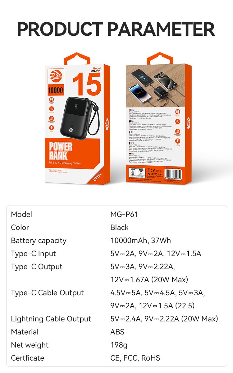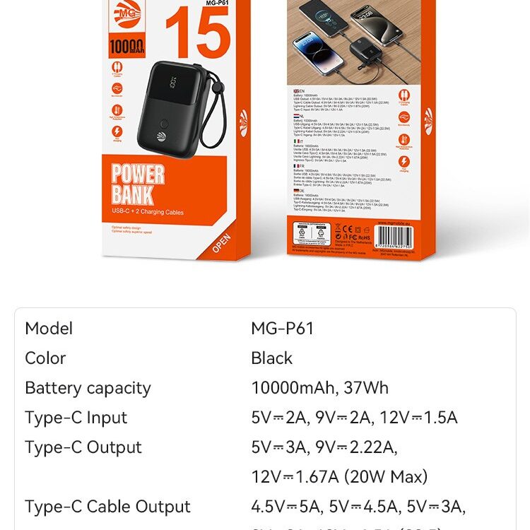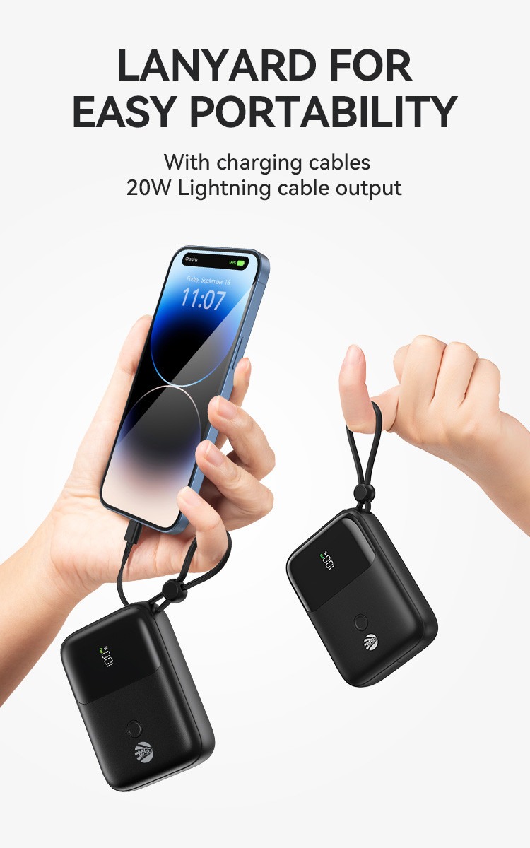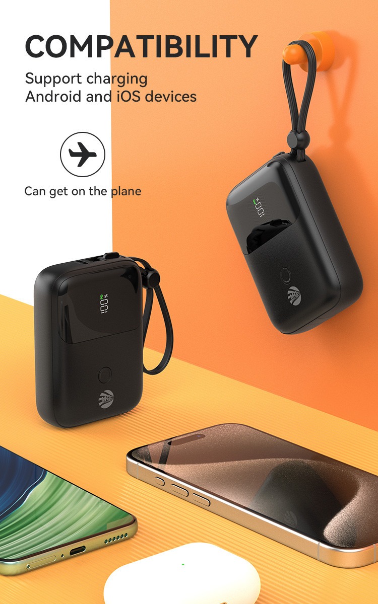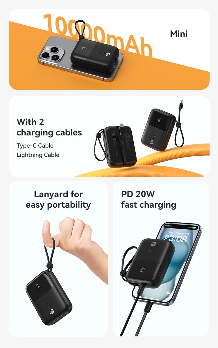 De powerbank is uitgerust met een USB-C-poort voor snel en efficiรซnt opladen, en wordt geleverd met 2 handige oplaadkabels, zodat je direct aan de slag kunt โ ongeacht het apparaat dat je gebruikt. Of je nu een Android-, iPhone- of ander USB-apparaat hebt, je bent altijd voorbereid.