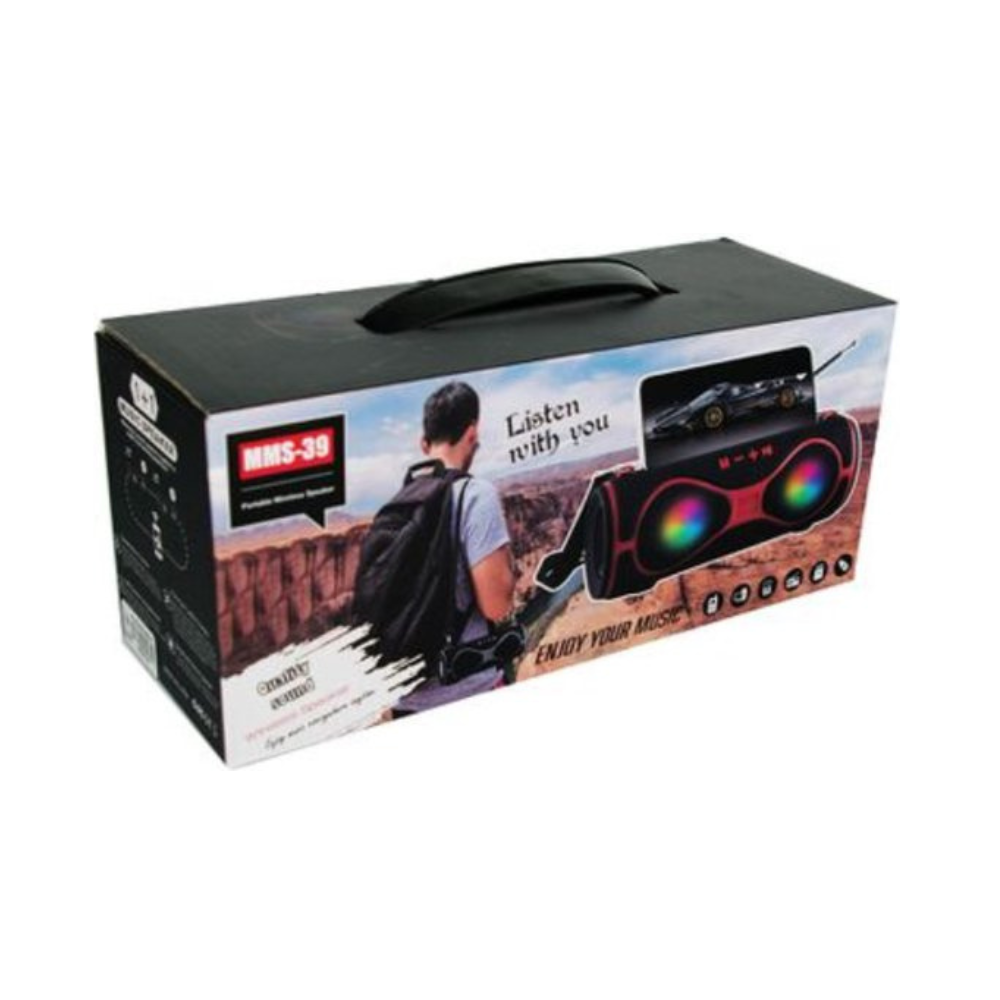 MMS-39 Wholesale Outdoor Portable Colorful Led Wireless Stereo Bluetooth Speaker Features: Music playback Bluetooth call TF FM AUX Bluetooth version: V5.0 Input voltage: DC-5V1A shell material: Aluminum alloy + ABS horn: 52 internal magnetic Battery specification capacity: Polymer 1200mA Product Size: 230*84*89mm Play time: Medium sound 3 hours Product weight: 600g Bluetooth distance: 10M Packaging material: Carton Product + color box weight: 650g Qty: 40set Carton size: 49.3*45.7*42.8CM Gross Weight: 31g